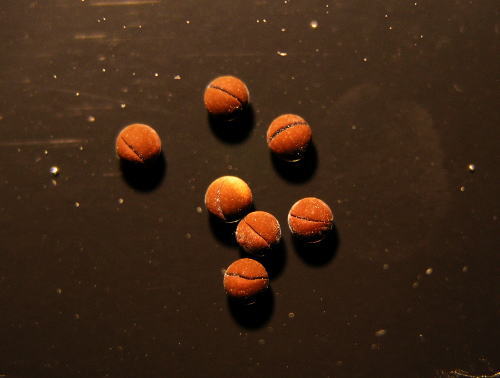 | Die Eier der Amphibien sind mesolecithal. Sie besitzen eine dunkel gefärbte und eine hellere Hemisphäre. Auf der dunkleren Seite ist der animale Pol lokalisiert und auf der Helleren der vegetative Pol. Gegenüber der Spermieneintrittstelle befindet sich eine unpigmentierte Zone, der "graue Halbmond". |