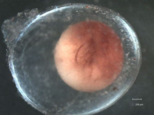 Der Embryo nimmt an Größe zu, die Ent- wicklung der inneren Organe kommt zum Abschluß und letztendlich verläßt der Embryo die schützende Gallerthülle. |
