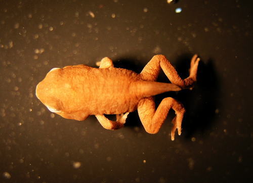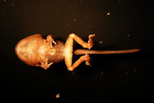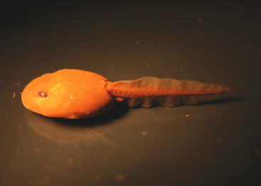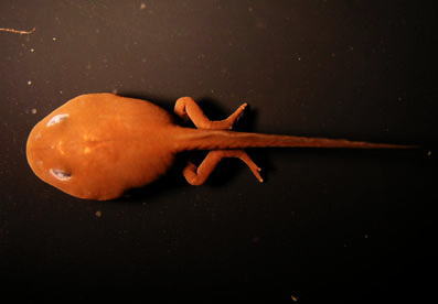 Ca. 2 Wochen später beginnen die Vorder- beine auszuwachsen. Sind auch die vollständig ausdifferenziert, wird der Schwanz nur noch sekundär zur Fortbewegung verwendet. |