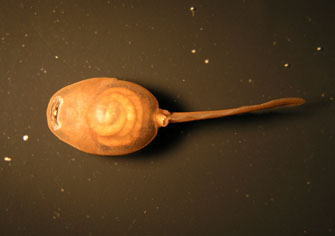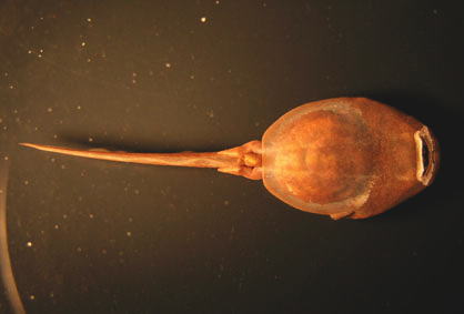 Die Hinterbeine beginnen auszuwachsen, haben aber noch keine Funktion und werden deshalb an den Schwanz angelegt. |