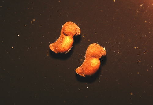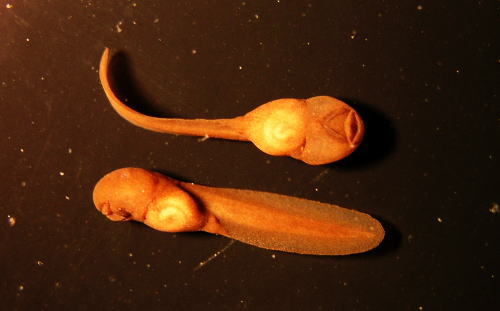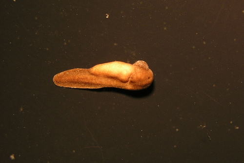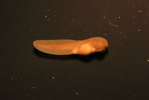 | Ca. 2 Wochen nach dem Ausschlüpfen aus der Gallerthülle sind die Knospen der Hinterbeine zu erkennen. |