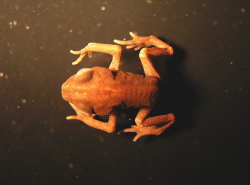 Ca. 3 Monate nach der Eiablage ist die Kröte für das Leben an Land ausgestattet. Der Schwanz hat sich vollständig zurück gebildet und die Fortbewegung erfolgt über die Beine. Die Atmung erfolgt nicht mehr über die Kiemen sondern über die Lunge und die Haut. Die Kröte muß das Wasser jetzt verlassen und an Land gehen, sonst würde sie ertrinken. |
