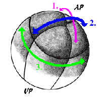 | Die 1. Furchungsteilung des Amphibieneies verläuft meridional vom animalischen zum vegetativen Pol der Eizelle durch die Eintrittstelle des Spermiums. Die 2. Teilung verläuft auch meridional, aber im 90° Winkel zur ersten Furchung. Die 3. Furchungsteilung verläuft äquatorial, senkrecht zur 1. und 2. Teilung in der Nähe des animalischen Pols. (inäquale Teilung) |