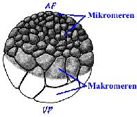 Es entstehen durch die Furchung ungleich große Tochterzellen. Die kleinen, dotterarmen Zellen am animalen Pol nennt man Mikromeren und die großen dotterreichen Zellen am vegetativen Pol Makromeren. Am Ende der Furchung besteht der Amphibienkeim aus einem Zellhaufen (Morula). |